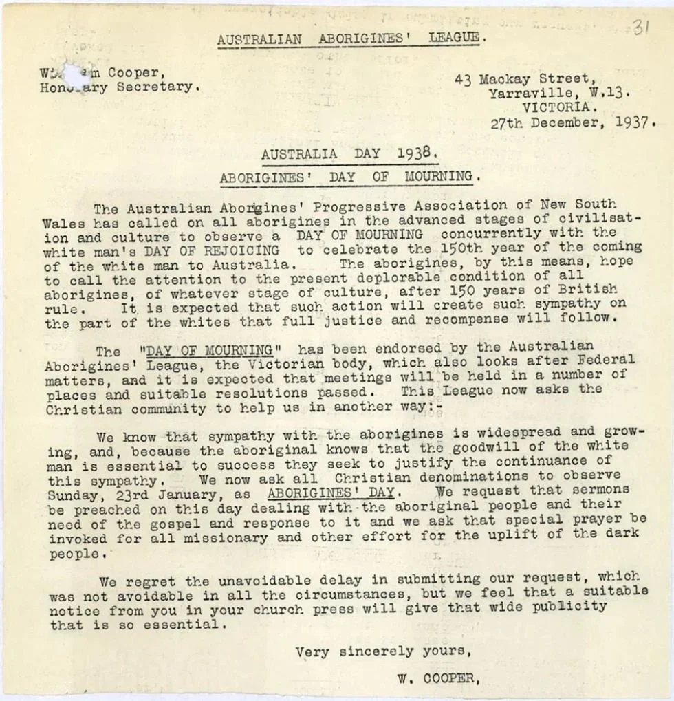 In 1938 the aboriginal leader William Cooper called on the churches of Australia to mark Aboriginal Sunday on the Sunday before Australia Day.